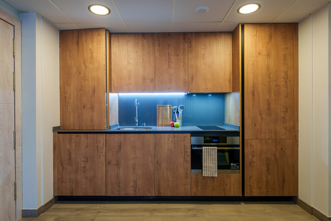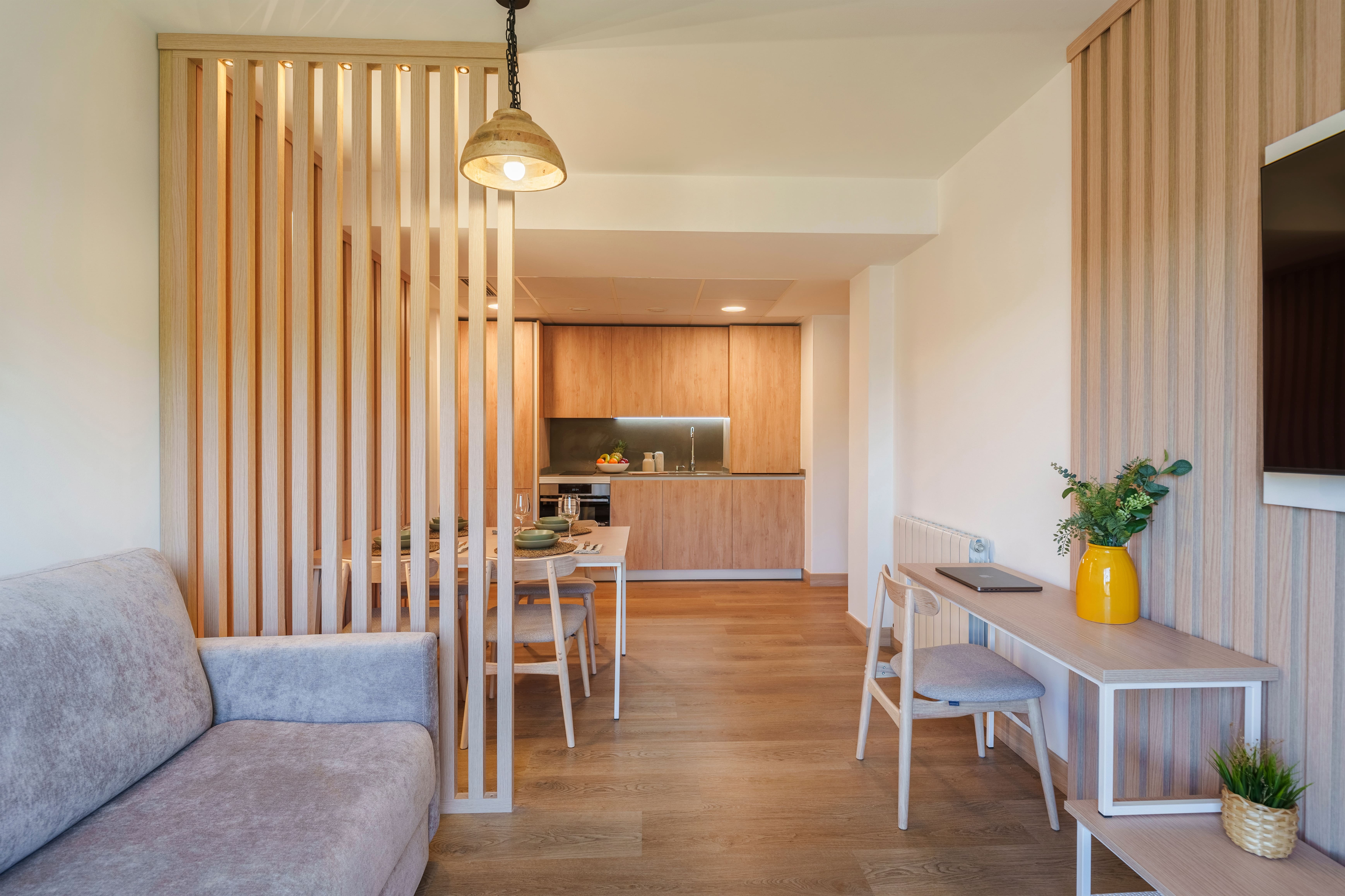 Renovated apartments with a modern design of up to 65 m² with two bedrooms. Ideal for families or groups of friends, the bedrooms can be equipped with a 1.50 m double bed or two single beds. They have a living room, open kitchen, and private bathroom with rain-effect shower. The kitchen is fully equipped with an oven-microwave, ceramic hob, fridge, washing machine, and dishwasher, among others. In the spacious living room, you will find a Smart TV, capsule coffee maker, desk, and sofa bed.