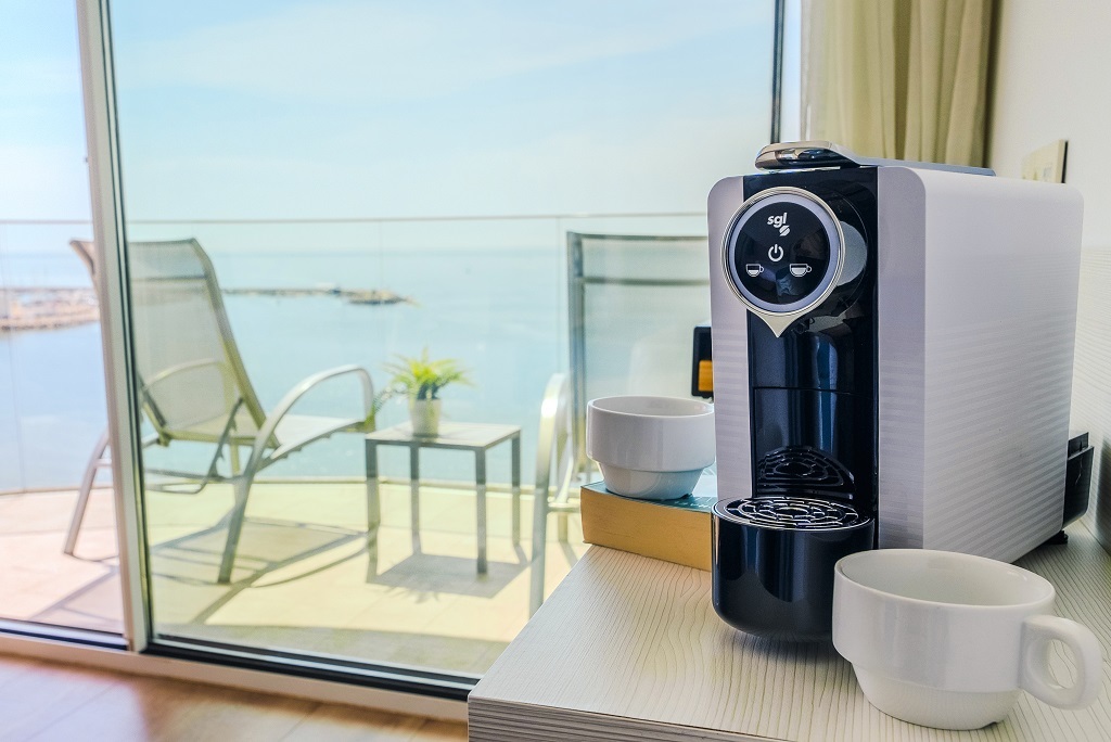Enjoy privileged views of the incredible blue Mediterranean Sea. These rooms have a terrace overlooking the sea, the hotel pool, and Puerto Marina. Elegant and bright rooms, with single or double beds and a sofa. Air conditioning or heating (depending on the season), 32" plasma TV, satellite channels, desk, telephone, free wifi, safe, full-length mirror, fridge, capsule coffee maker, bathroom with shower, hairdryer and amenities.