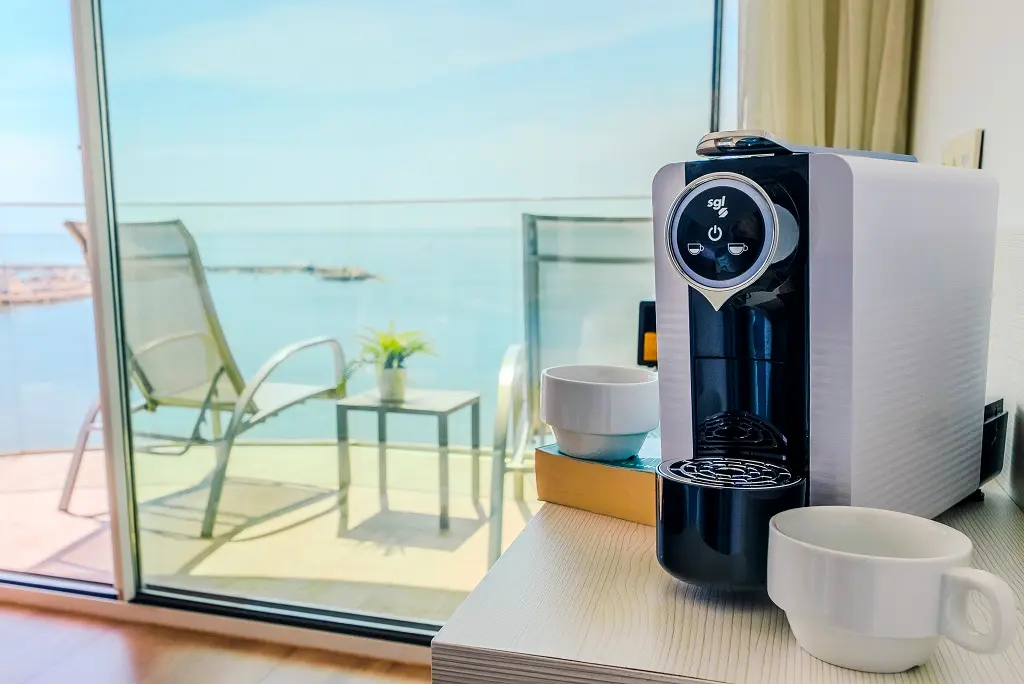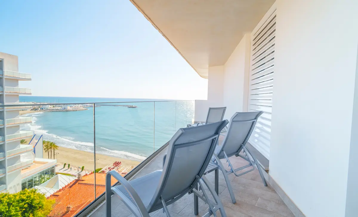 Vista al mar desde sala con sofás y balcón con sillas y bebida.
