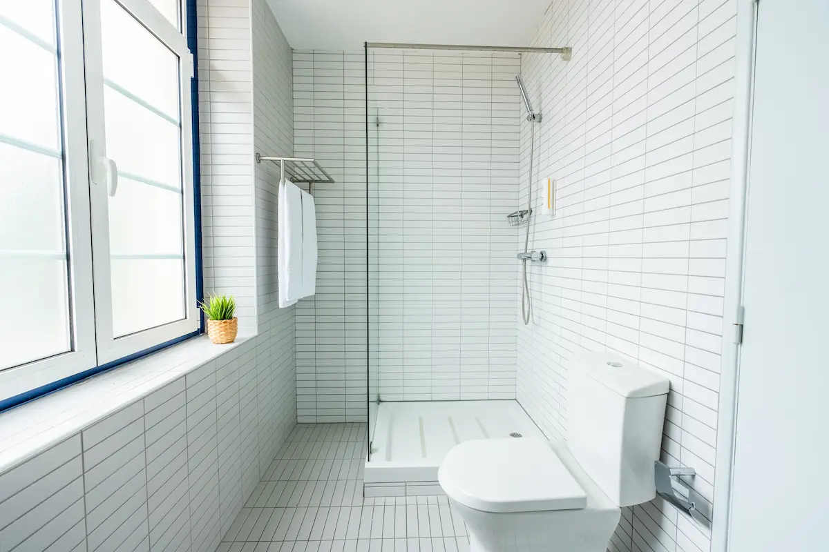 Sala moderna con comedor, planta y ventana grande al fondo.