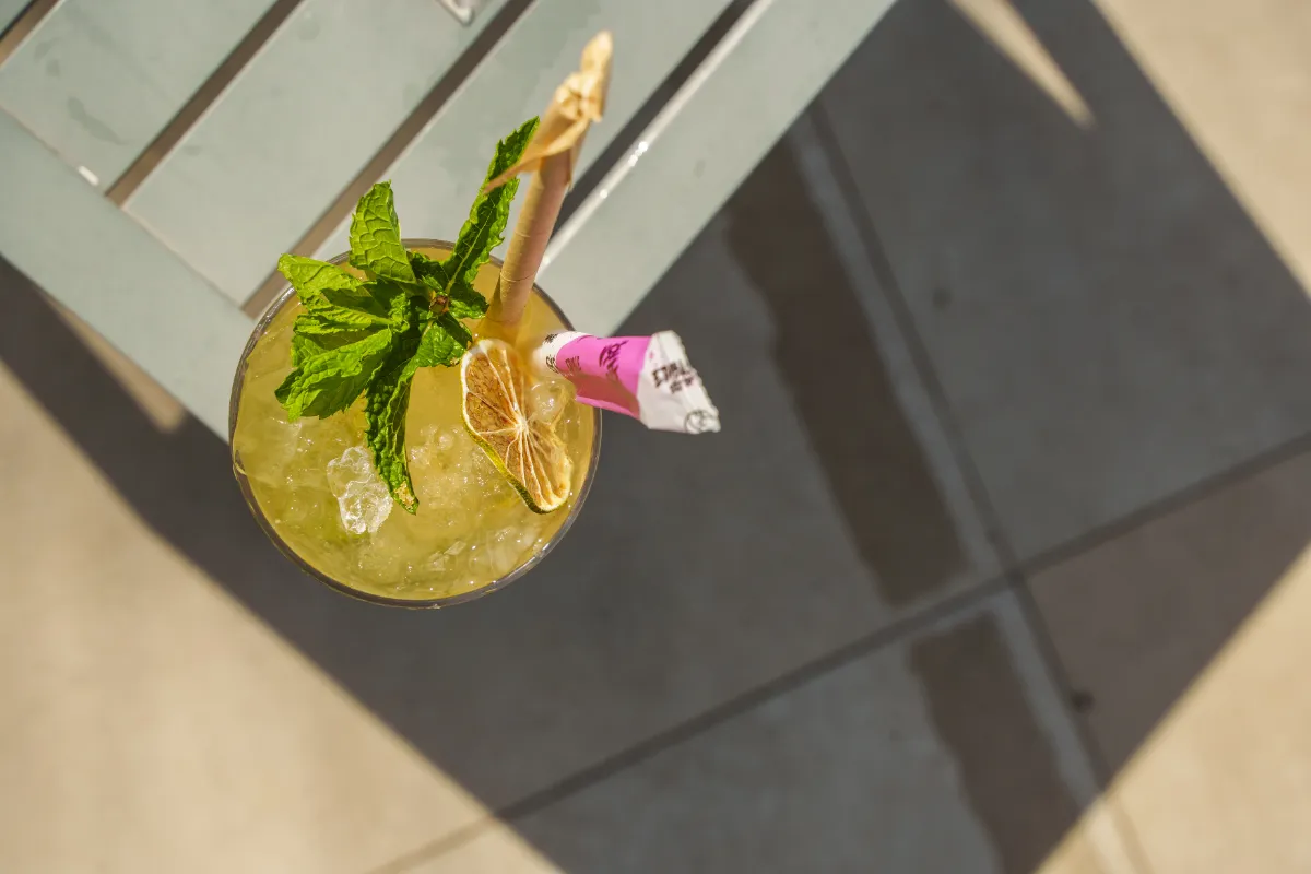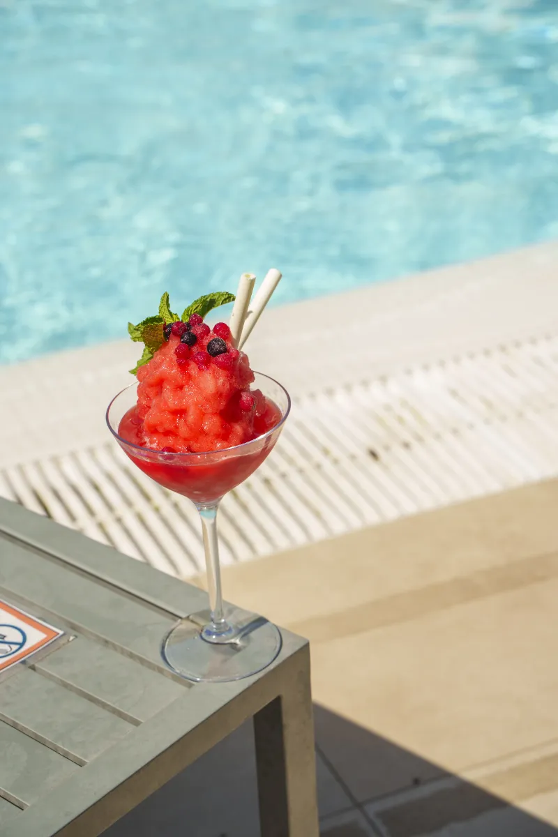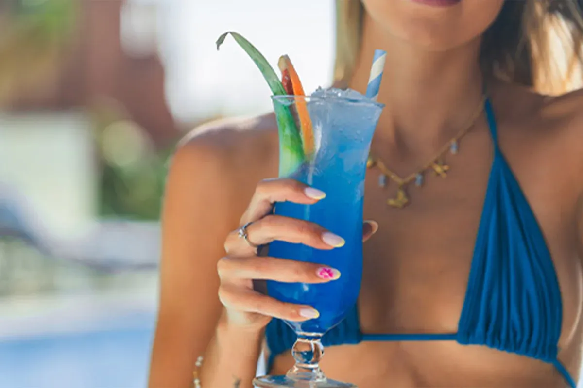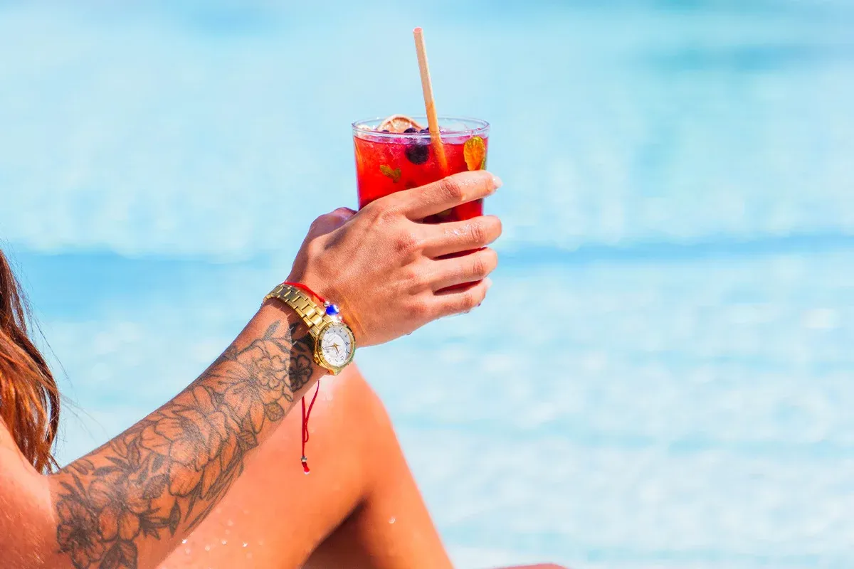 Personas en la piscina disfrutando de bebidas bajo el sol.