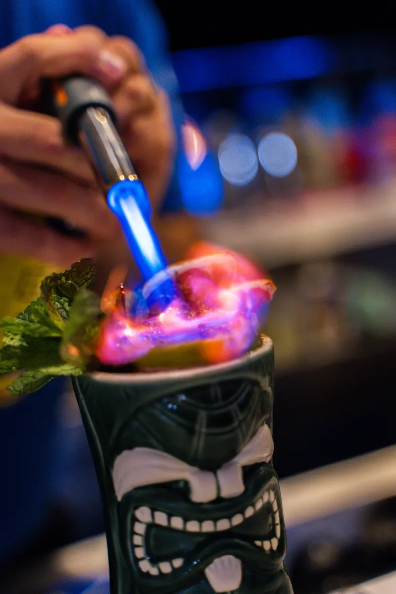 Cinco personas posan junto a un mostrador de madera frente a un letrero que dice "spirit".