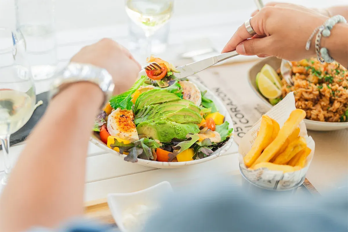Persona cortando pescado en plato, acompañado de vino blanco.