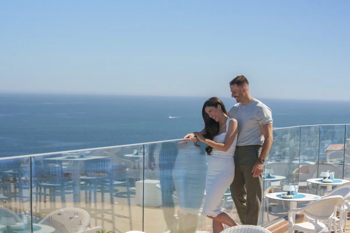 Habitación de hotel con dos camas; pareja de pie en el balcón disfrutando la vista al exterior.