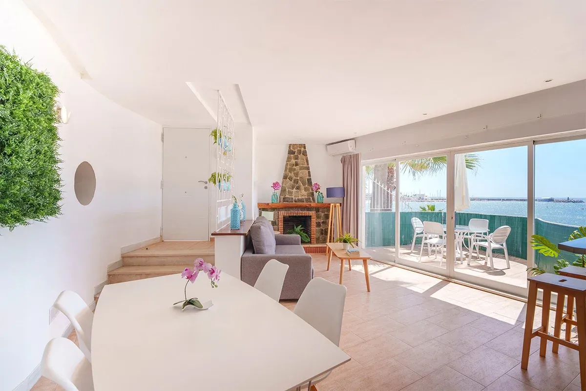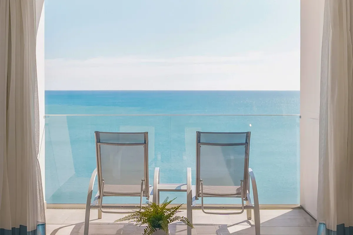 Vista al mar desde sala con sofás y balcón con sillas y bebida.