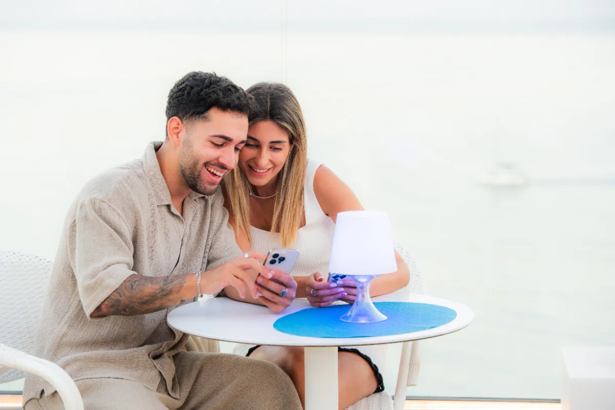 Pareja sentada en un sofá verde, conversando junto a una mesa con bebida.