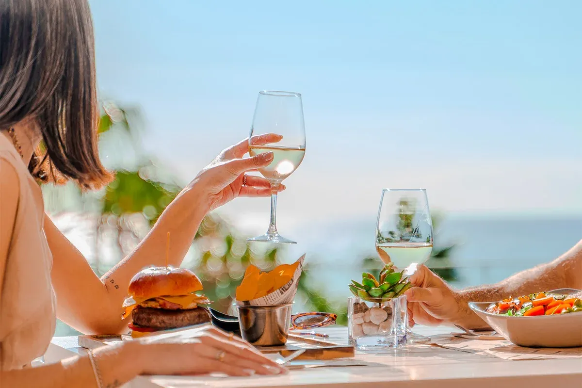 Hombres comiendo y bebiendo en un restaurante con vistas a la montaña.