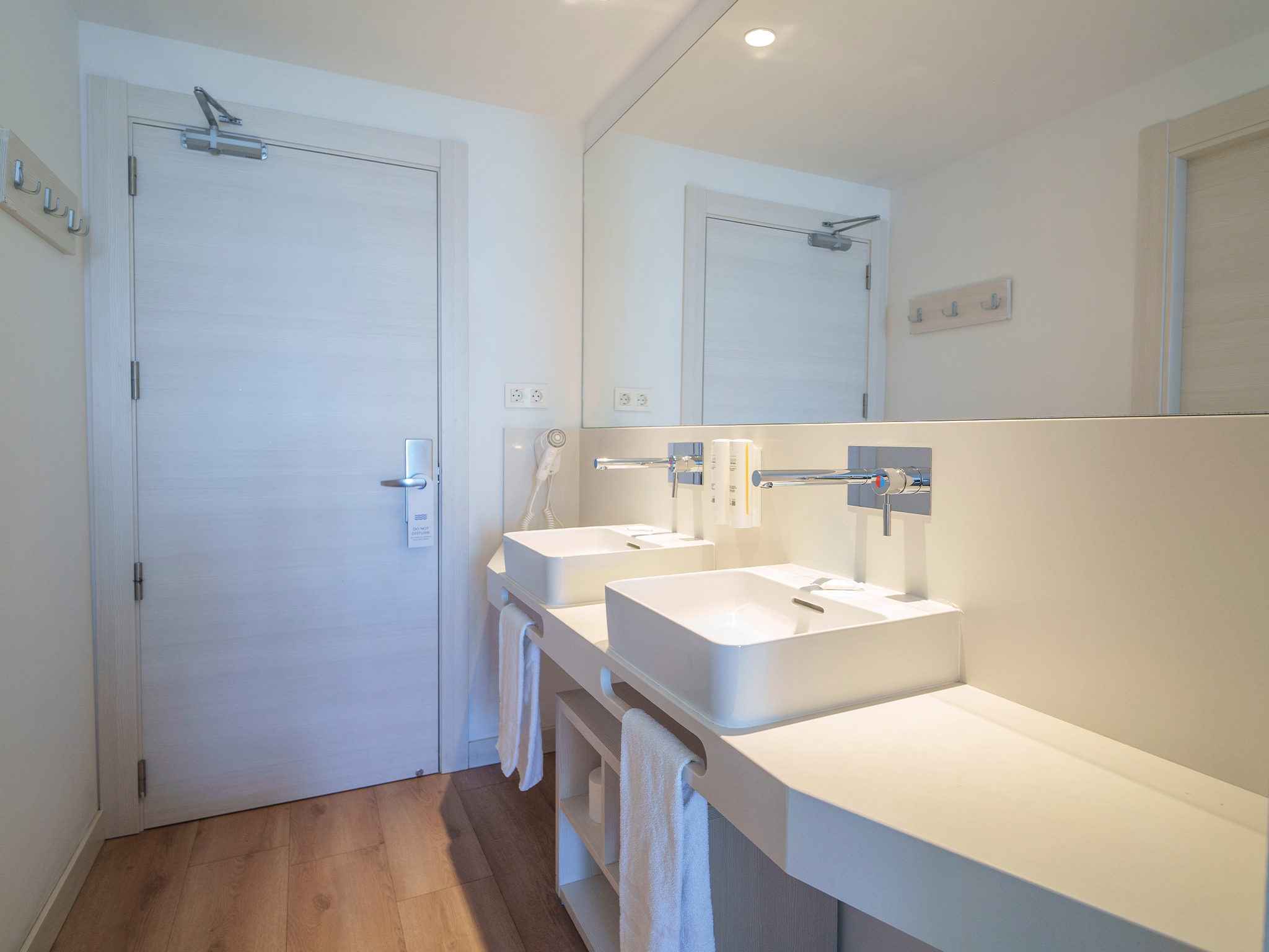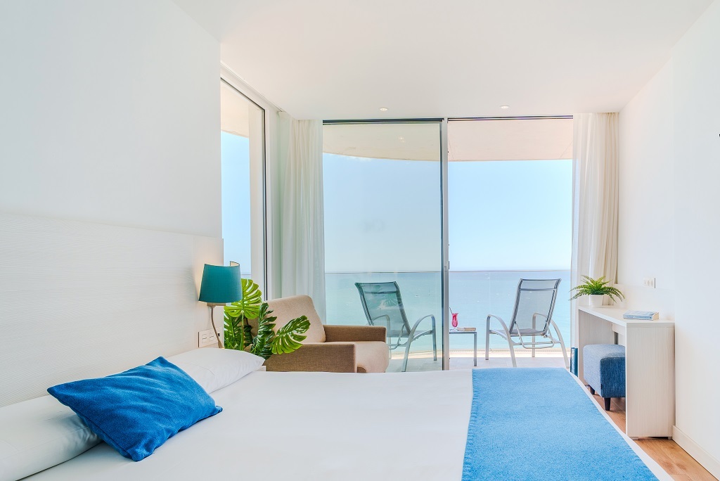 Habitaciones con increíble vista panorámica para disfrutar en su gran terraza. Estas habitaciones cuentan con una amplia terraza amueblada con más de 13 m² con vista frontal al mar, a la piscina del Hotel y al Puerto Marina. Disponen de una cama matrimonial o 2 camas individuales y un sofá. Aire acondicionado o calefacción (según temporada), TV de plasma de 32", canales vía satélite, escritorio, teléfono, wifi gratuito, caja fuerte, espejo de cuerpo completo, nevera, cafetera de cápsulas, baño con ducha, secador de pelo y amenities.