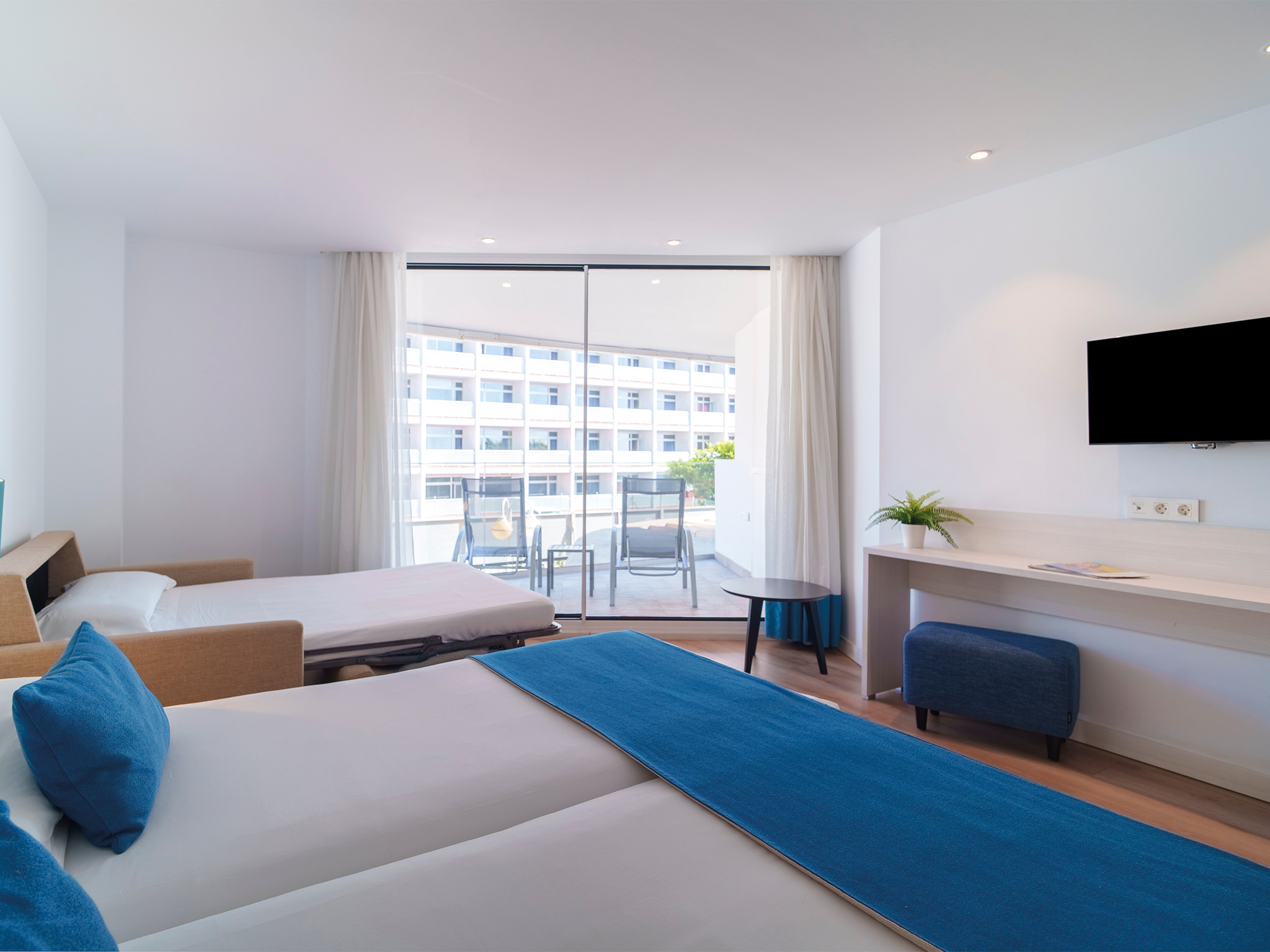 Habitaciones triples con una elegante y acogedora decoración. Estas confortables habitaciones cuentan con terraza amueblada de a partir de 7 m² y vista lateral al mar. Disponen de todo lo necesario para vivir unos días perfectos en primera línea de playa: 2 camas individuales o una cama matrimonial, y un sofá cama. Aire acondicionado o calefacción (según temporada), TV de plasma de 32", canales vía satélite, escritorio, teléfono, wifi gratuito, caja fuerte, espejo de cuerpo completo, nevera, tetera, baño con ducha, secador de pelo y amenities.