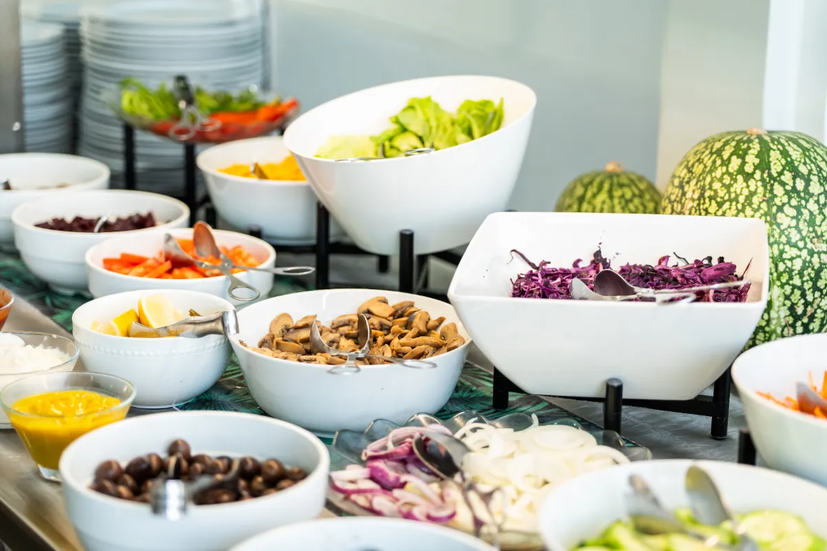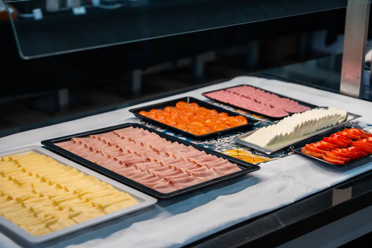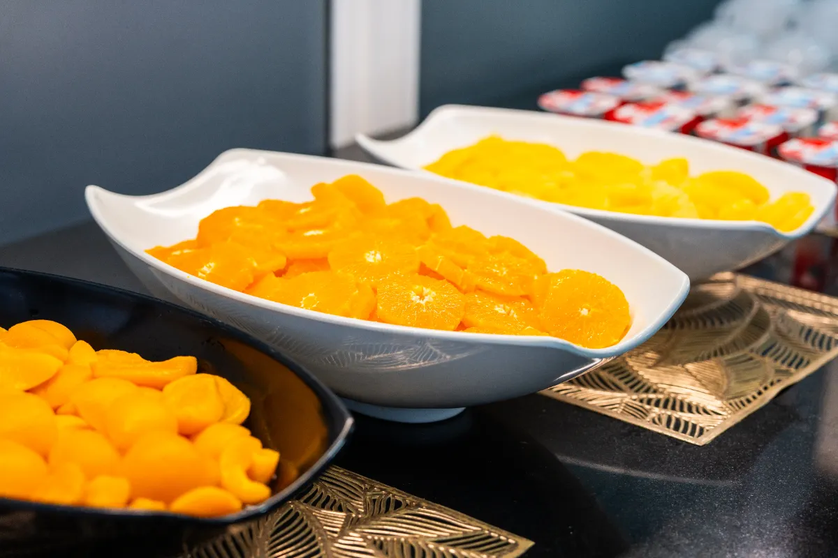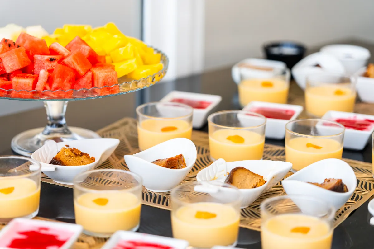 Desayuno variado con café, jugo, frutas, pasteles y tostadas.
