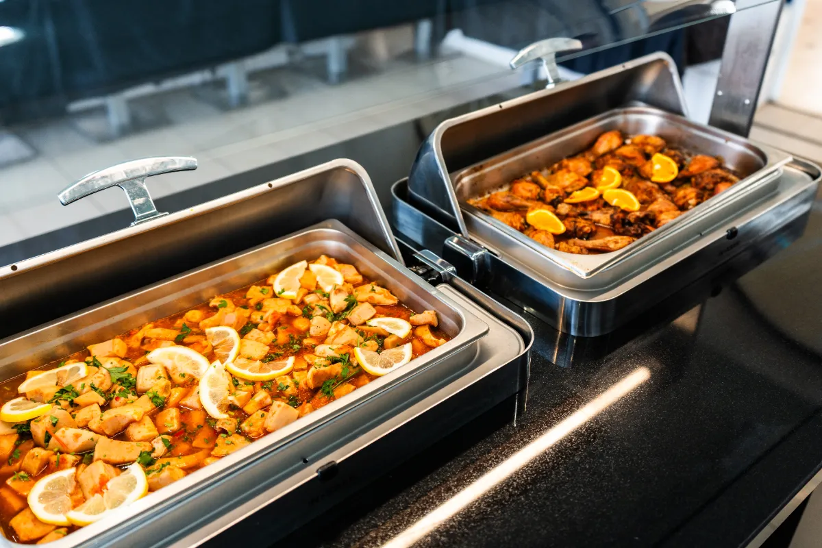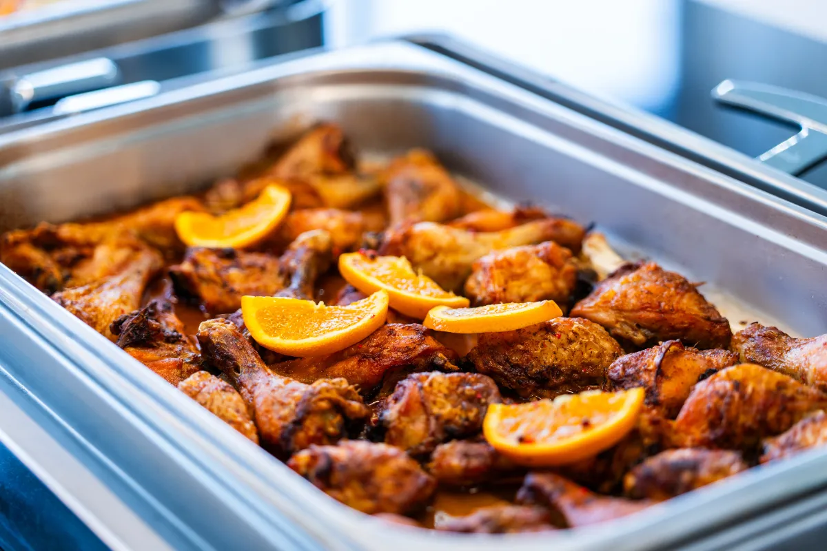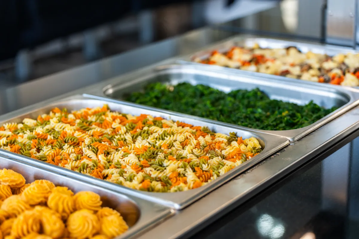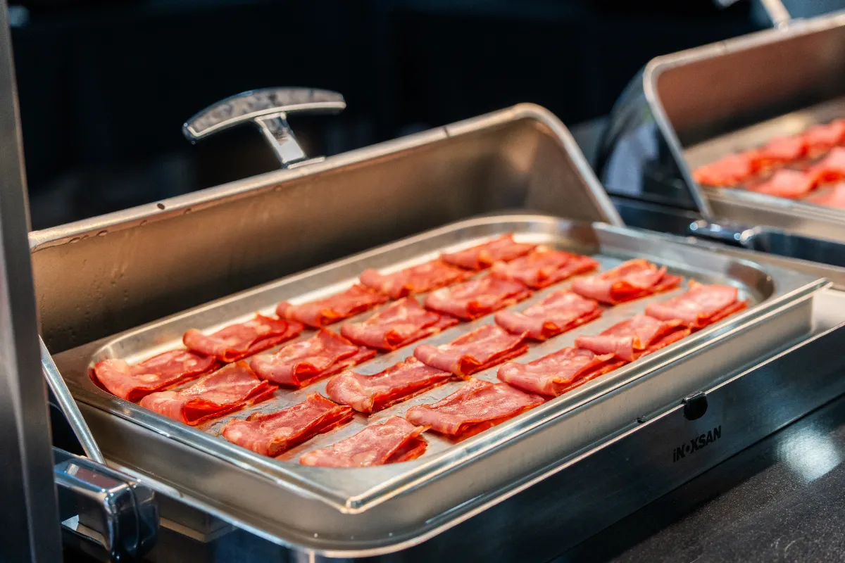 Desayuno variado con café, jugo, frutas, pasteles y tostadas.