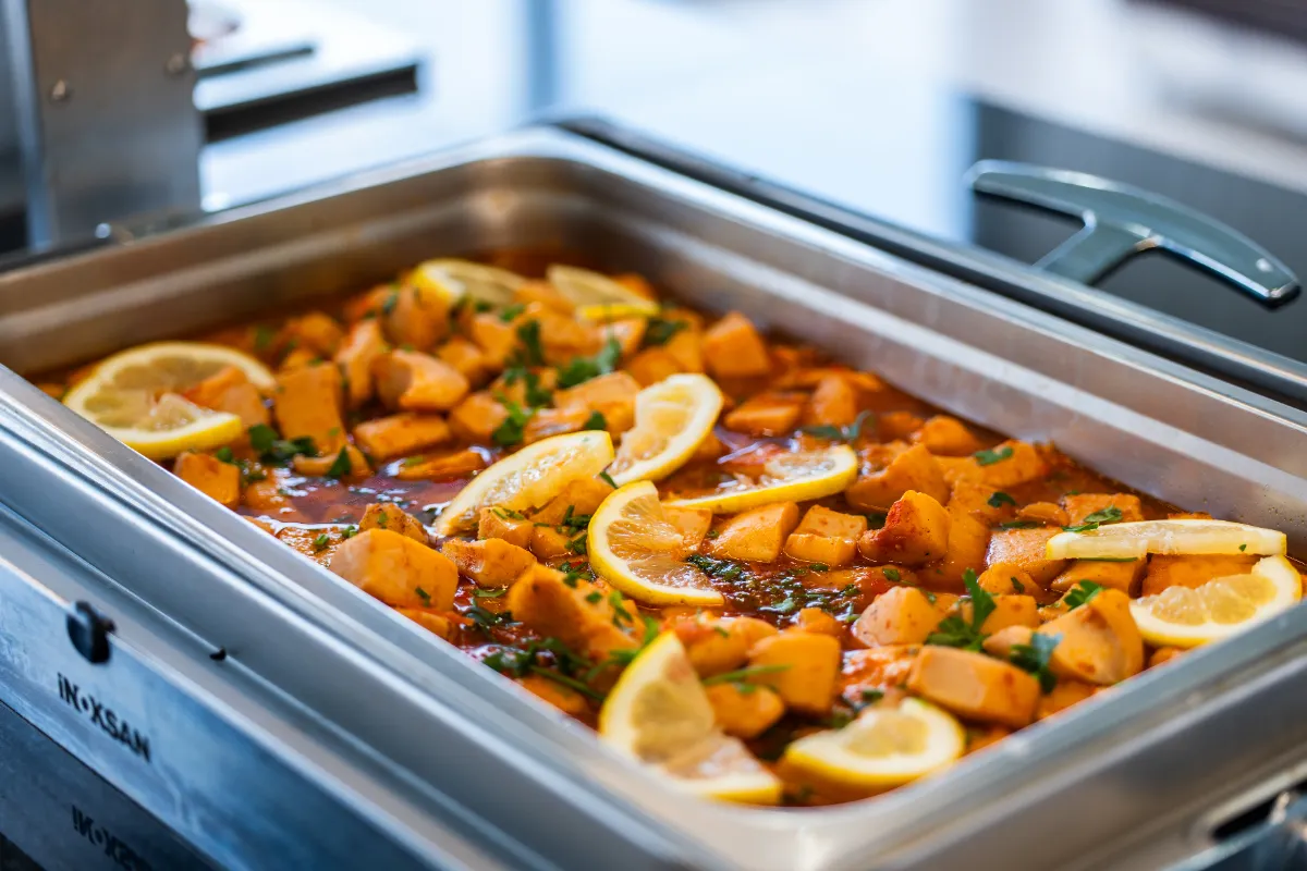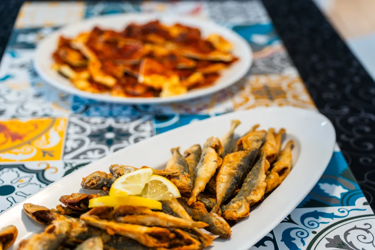 Persona cortando pescado en plato, acompañado de vino blanco.